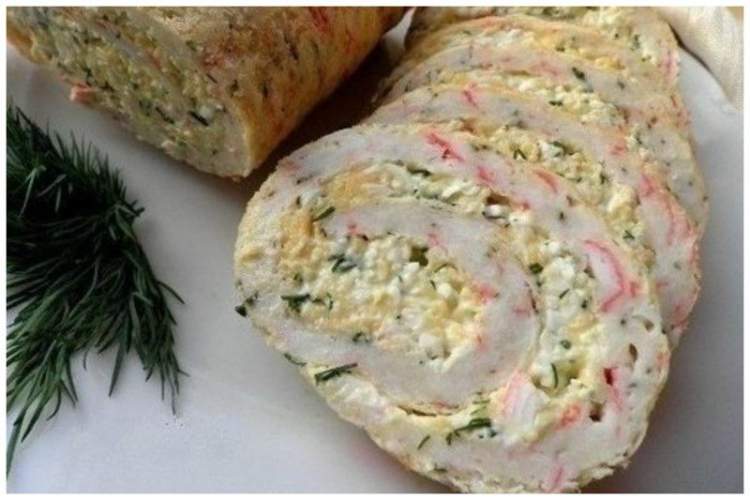 Тремо в миску 200 грамів твердого сиру, 200 грам крабових паличок, додаємо 5 яєць, 150 грам майонезу, 5 столових ложок борошна, краплю молока, щоб вийшла консистенція густої сметани. На деко викладіть рукав для запікання (розріжте його, щоб звисали з країв), змастіть рослинною олією – вилийте на нього суміш і в духовку на 5-10 хвилин (стежте, готується дуже швидко, підуть згори бульбашки, діставайте). Поки робиться основа, включіть фантазію – всередину можете покласти що завгодно – сир, перетертий з часником, фарш із зеленню, варені яйця, маслини і т.д. Дістаєте вашу масу, викладаєте зверху «замазку» і звертаєте рулет. Залишаєте до повного охолодження. Якщо кладете фарш, то поставте в духовку ще хвилин на 10.
