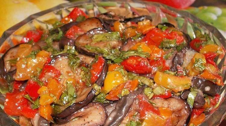 Баклажани нарізаємо зі шкіркою, не очищаючи, напів колами, перець нарізаємо соломкою, часник нарізаємо на дрібні шматочки.
