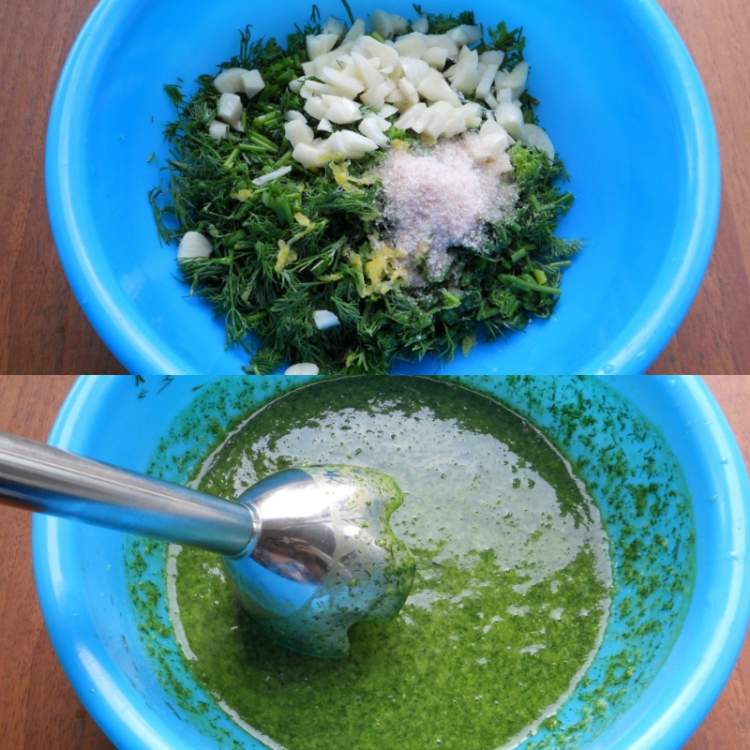 - Помийте зелень кропу, висушіть на паперовому рушнику і подрібніть в блендері разом з очищеними зубчиками часнику.