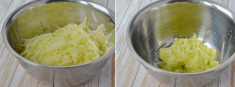- Коли кабачки пустять сік, їх потрібно віджати. В результаті повинно вийти близько 350 грам кабачкової маси.