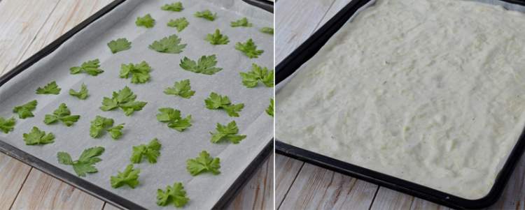 - На пергамент виклади зелень, а поверх вилий тісто і розрівняй його по поверхні форми. Вибирай форму так, щоб шар тіста був невисоким, оптимально – до 2 см.