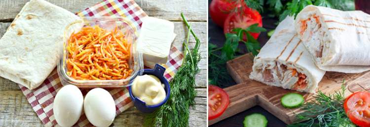 - На перший лаваш натри на тертці плавлений сирок. Прикрий другим листом, змасти його майонезом і виклади поверх дрібно порізану курку і яйця. Прикрий третім листом, а зверху виклади моркву і зелень.