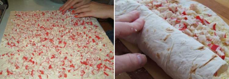 - Змасти майонезом перший лаваш і розклади на ньому моркву. У центр по всій довжині виклади цілі крабові палички і зверни все в рулет.