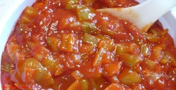 Помідори з часником пропустити через м’ясорубку. Кабачки нарізати маленькими кубиками, змішати з помідорами. Додати сіль, цукор, соняшникову олію. Все тушкувати 30 хвилин. Потім додати нарізаний соломкою перець і оцет. Після того як маса закипить, варити 20 хвилин. Потім викласти в стерилізовані банки.