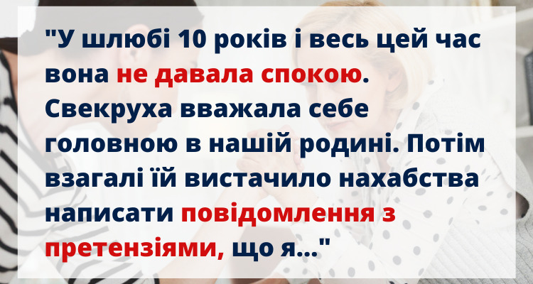 “У шлюбі 10 років і весь цей час вона не давала спокою. Раніше не розуміла, чому вона так поводиться. Думала, що зі мною щось не так. Виявляється, вона ревнує свого сина до мене, ну і, звичайно, увесь цей час вважала себе головною в нашій родині. Останній раз ми спілкувалися рік тому, вона випила і від нудьги почала писати мені гидоти, що я не так виховую сина, чоловіка не поважаю і все в такому дусі. Я догадувалася про такі її претензії, але не очікувала, що їй вистачить нахабства це мені написати.