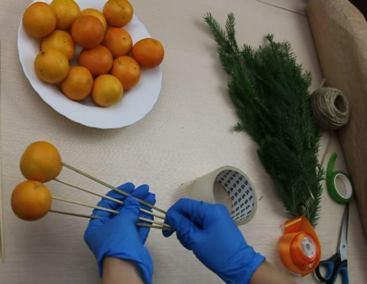 Потім починаємо складати фруктовий букет. Викладаємо мандарини по колу й вставляємо ще палички з гілочками. Обертаємо кожен мандарин скотчем й прикріплюємо до букета.