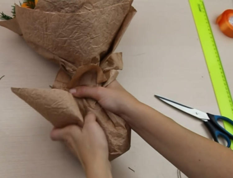 Перший шматок паперу обгортаємо навколо букету й все фіксуємо шпагатом.