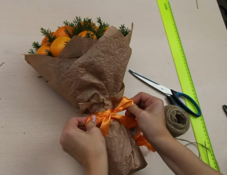 Неодмінними атрибутами будь-якого Нового року є саме запах хвої та мандарин, тому чудовим варіантом подарунку є створення новорічного букета саме з цих елементів. Вигляд в нього просто неперевершений, тільки гляньте!